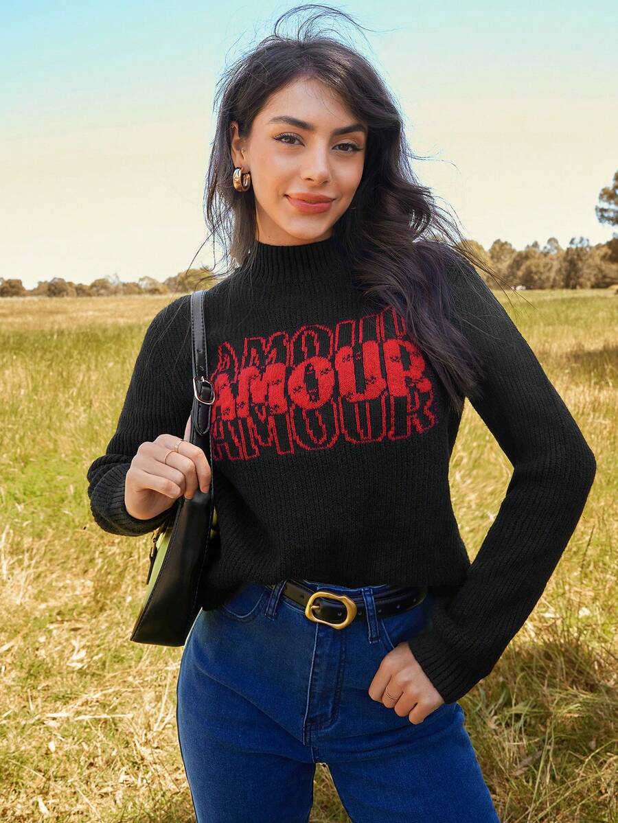 SHEIN Frenchy Christmas Letter Pattern Ribbed Knit Sweater