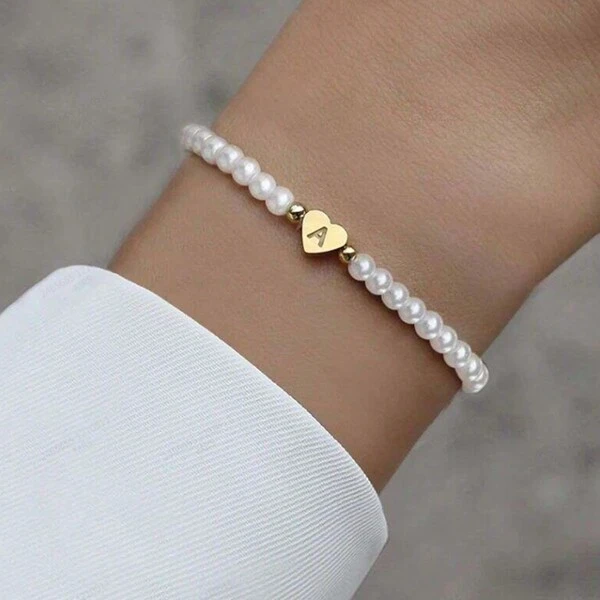 Classic A-Z Heart Initial Imitation Pearl Bead Bracelet Name Bracelet Jewelry Gift For Women