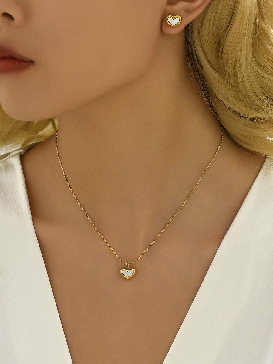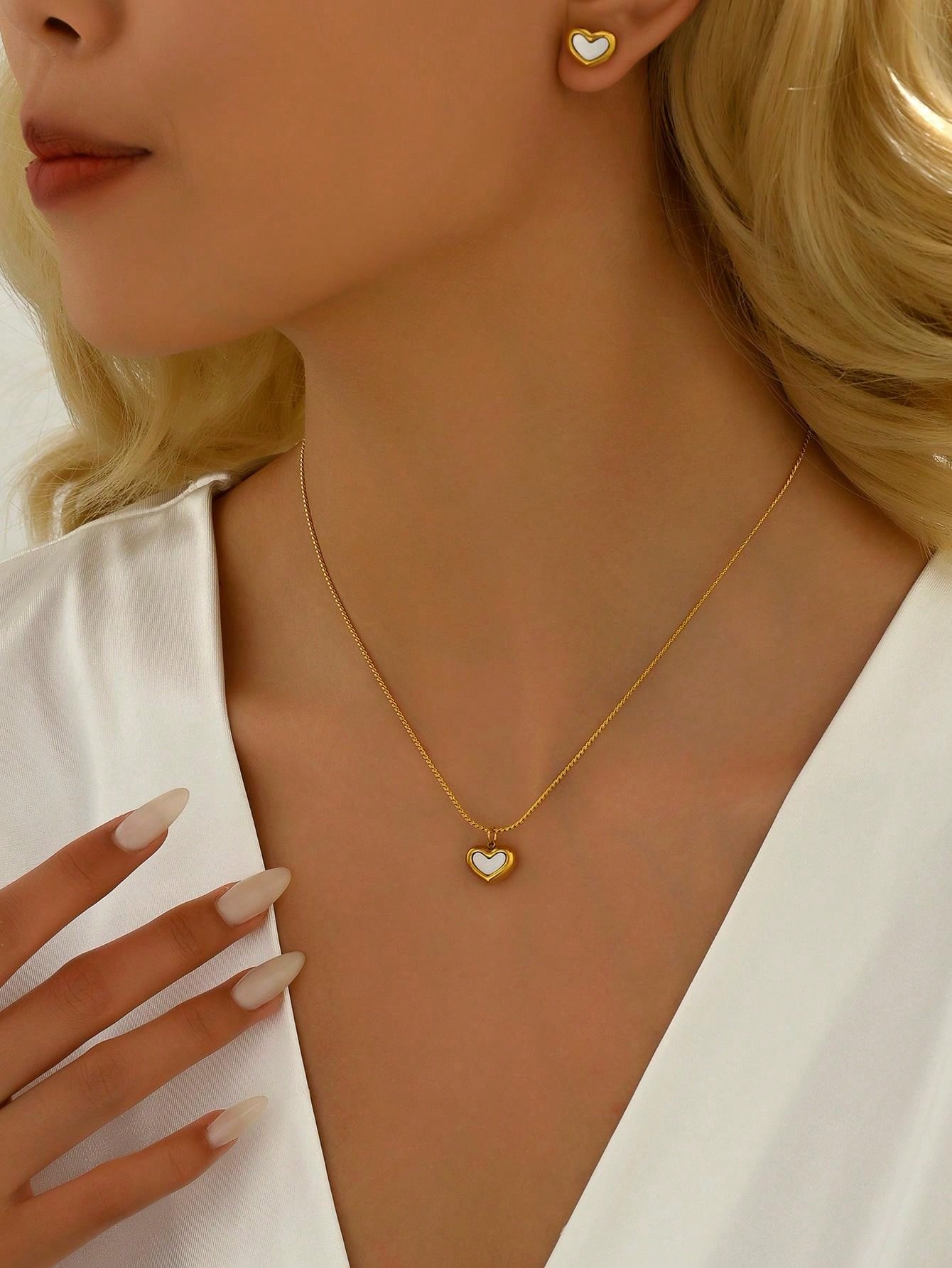Classic Titanium Steel Necklace & Stud Earrings Set With White Mother Of Pearl Heart Pendant, 18k Gold Plated, Ideal For Women Festival Gift