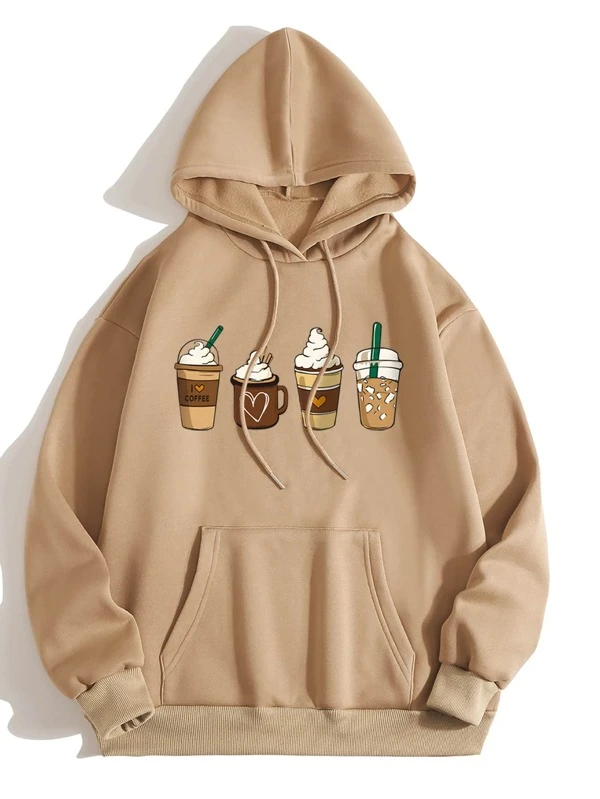SHEIN Qutie Coffee And Slogan Graphic Kangaroo Pocket Drawstring Thermal Hoodie