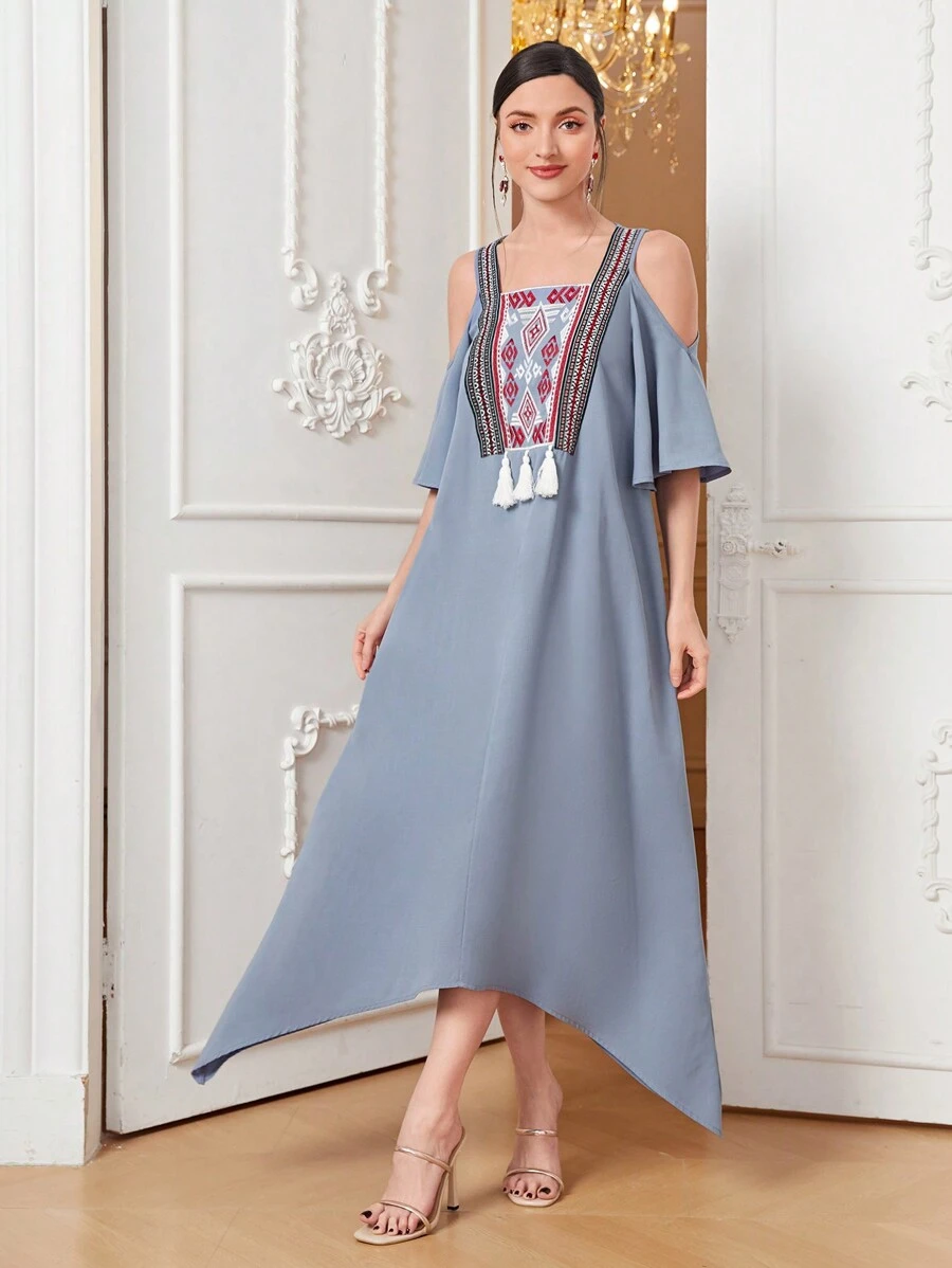 SHEIN Mulvari Cold Shoulder Tassel Trim Asymmetrical Hem Dress