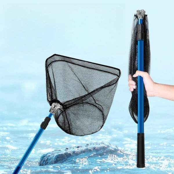Collapsible & Extendable Fine Mesh Stainless Steel Folding Fishing Landing Net With Telescopic Pole, Triangular Shape, Fishing Tool