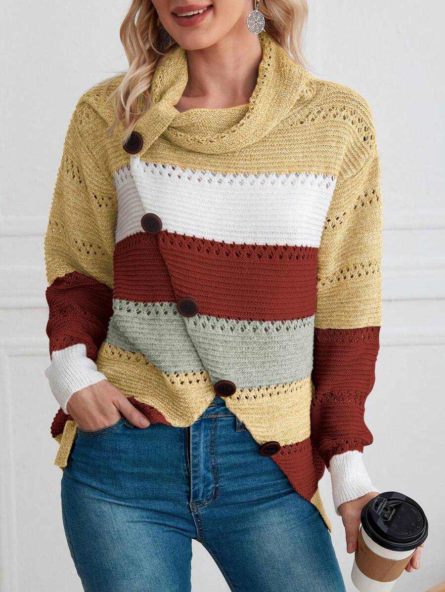 Color Block Cowl Neck Button Detail Pointelle Knit Sweater