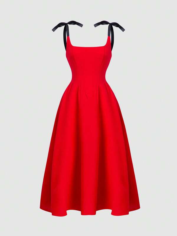 Color Block Dress With Bowknot Shoulder Straps & Belted Waist