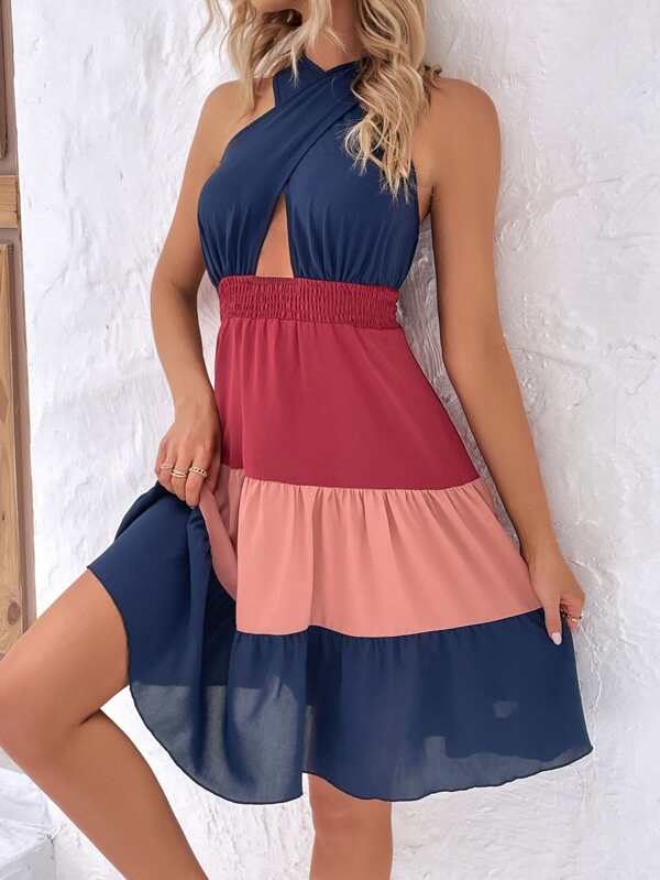 SHEIN VCAY Colorblock Cross Wrap Backless Ruffle Hem Dress