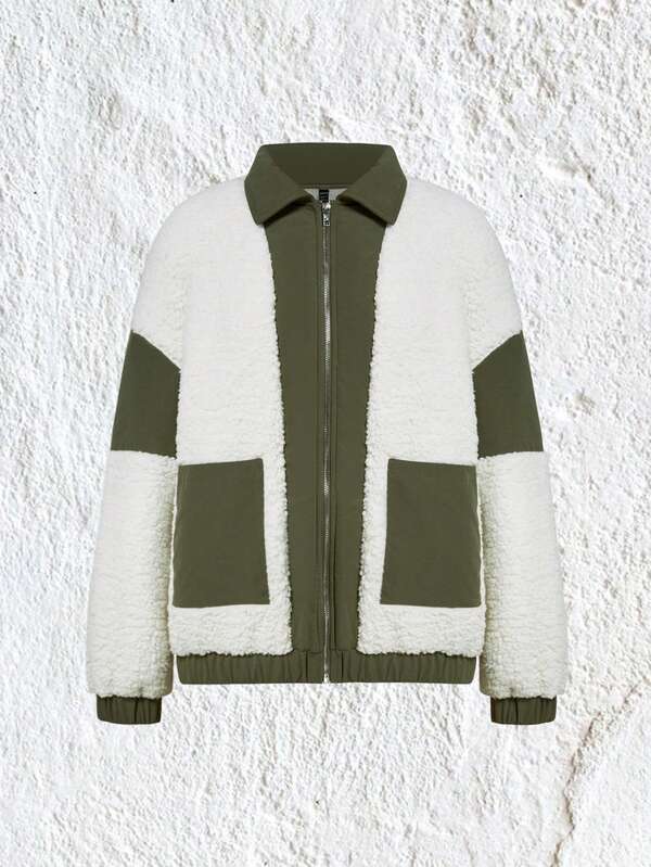 SHEIN EZwear Colorblock Drop Shoulder Contrast Trim Teddy Jacket