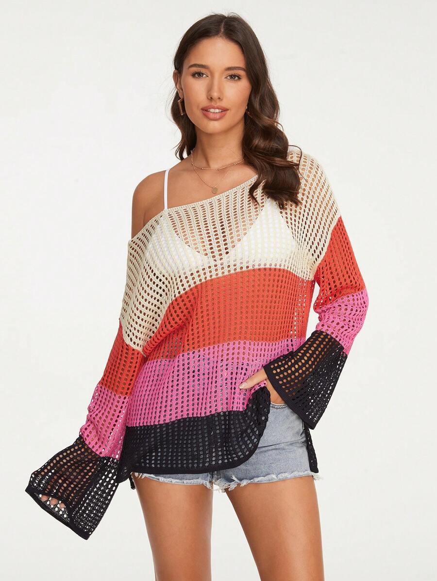 SHEIN VCAY Colorblock Hollow Out Asymmetrical Shoulder Cover Up Without Bikini Top