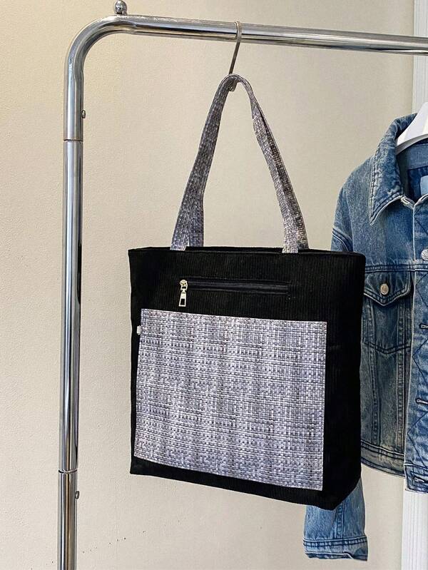 Colorblock Shoulder Tote Bag Plaid Pattern Polyester
