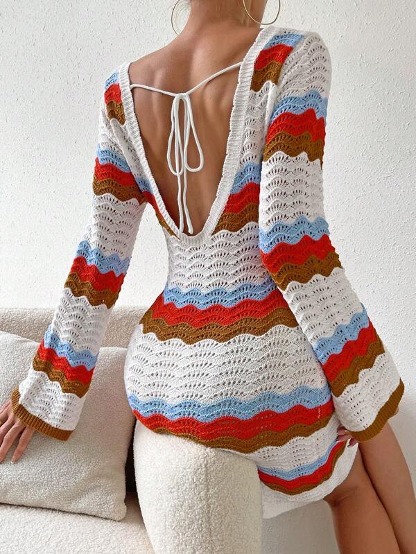 SHEIN VCAY Colorblock Tie Backless Pointelle Knit Sweater Dress