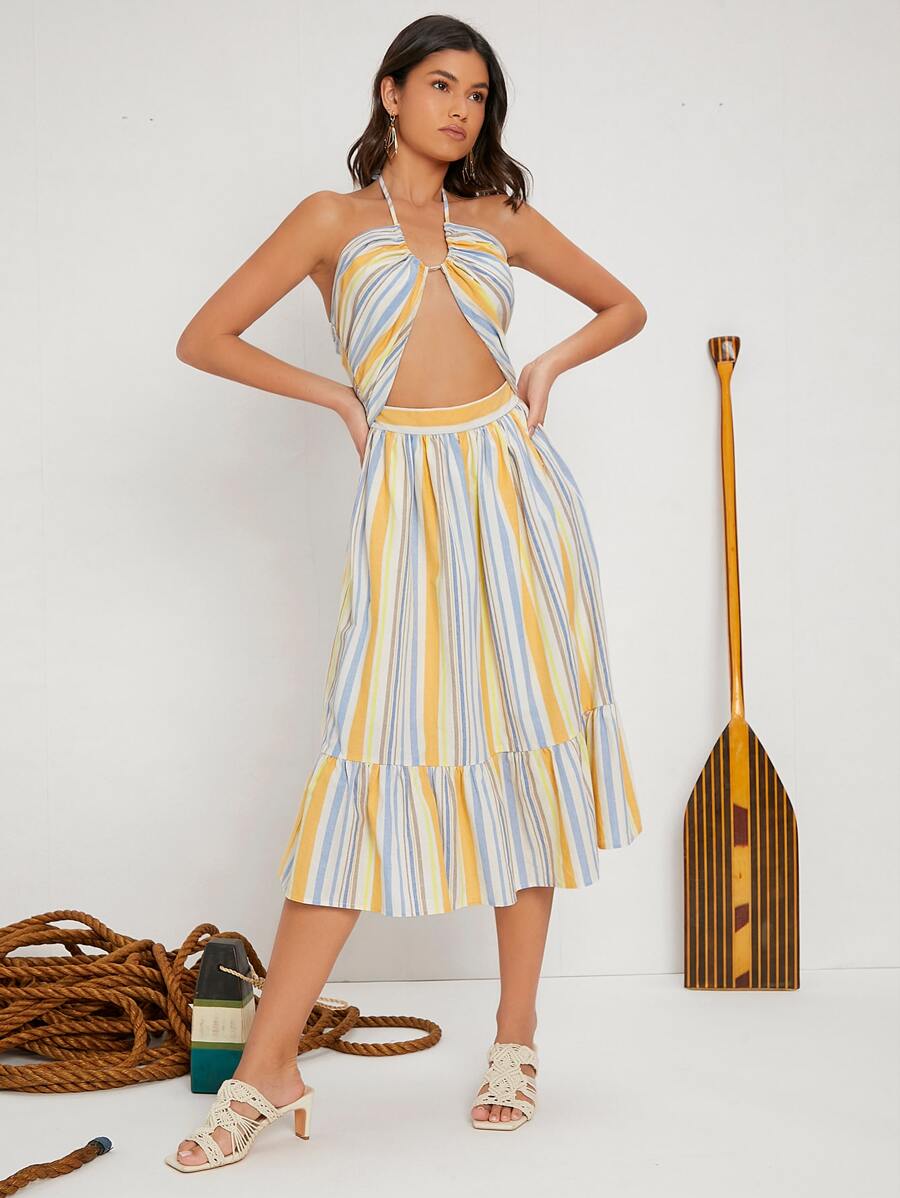 SHEIN VCAY Colorful Striped Cut Out Halter Neck Backless Ruffle Hem Dress
