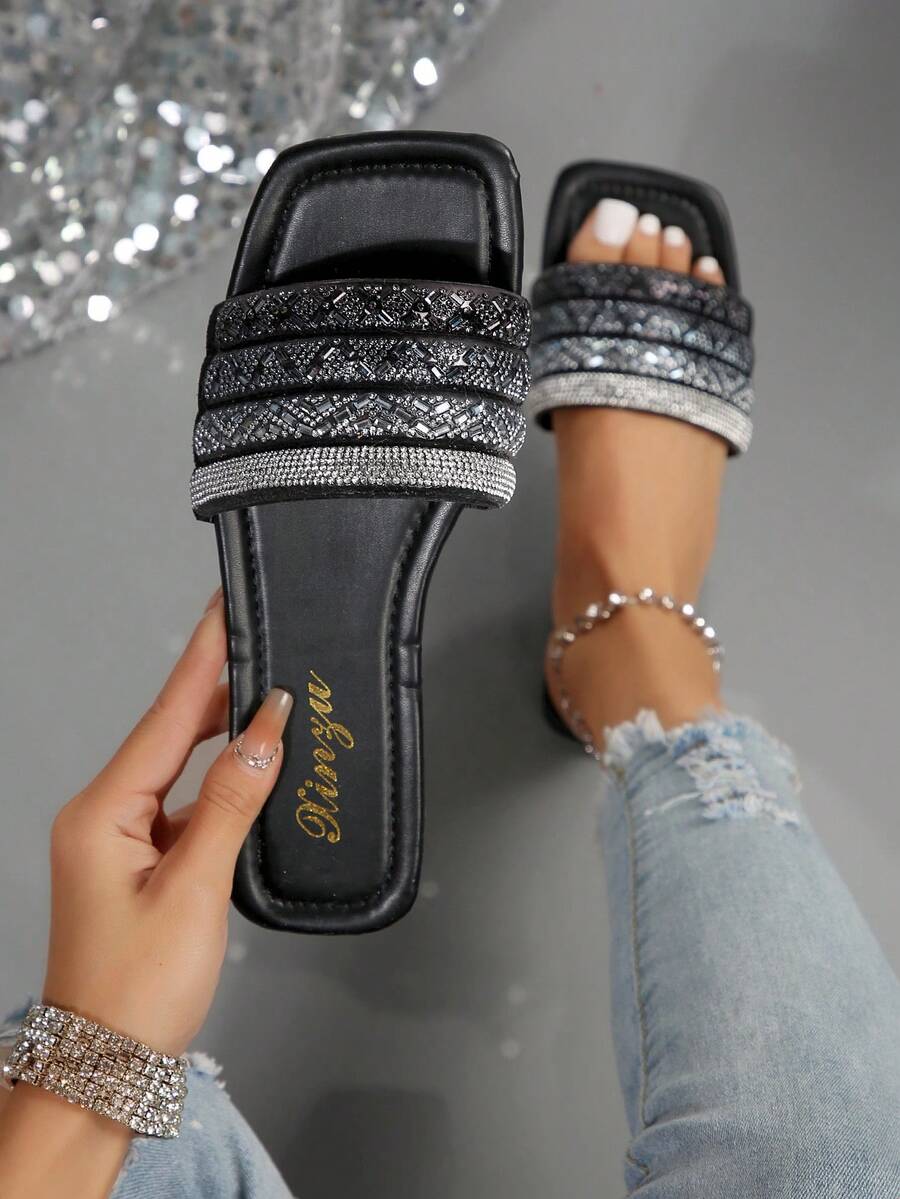 Comfortable & Versatile Anti-skid Large Size Black/white Ombre Rhinestone Decor -inspired Women's Flat Sandals