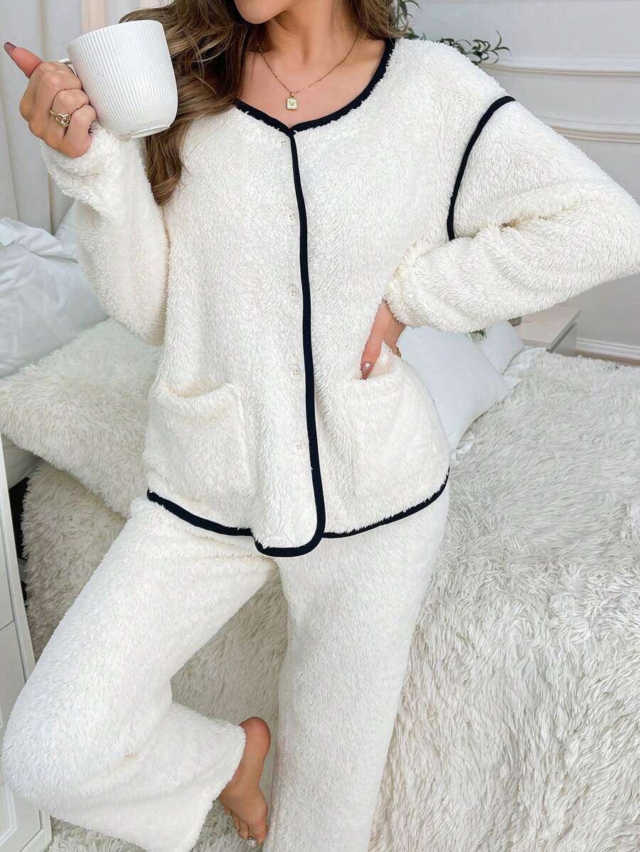Contrast Binding Dual Pocket Drop Shoulder Flannel Lounge Set