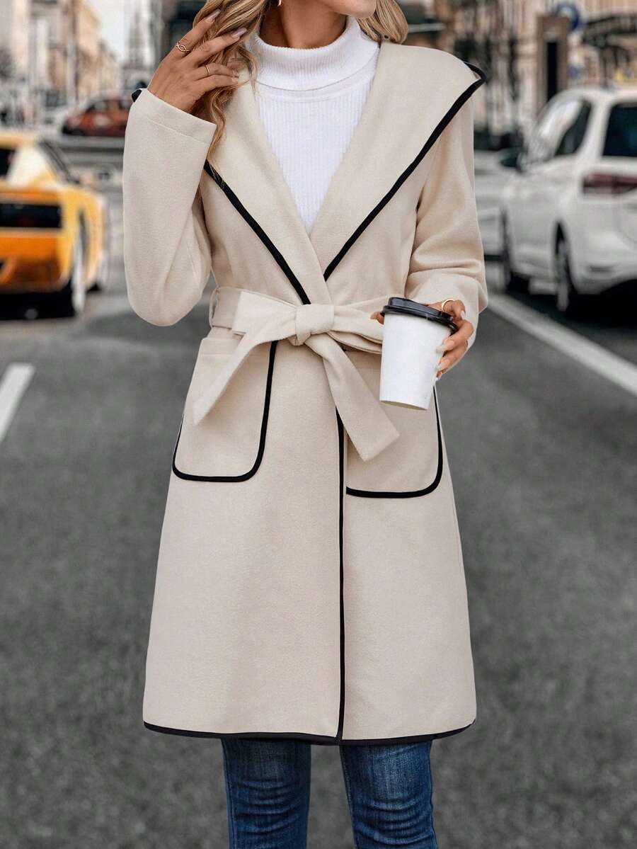 Contrast Binding Hooded Belted Overcoat