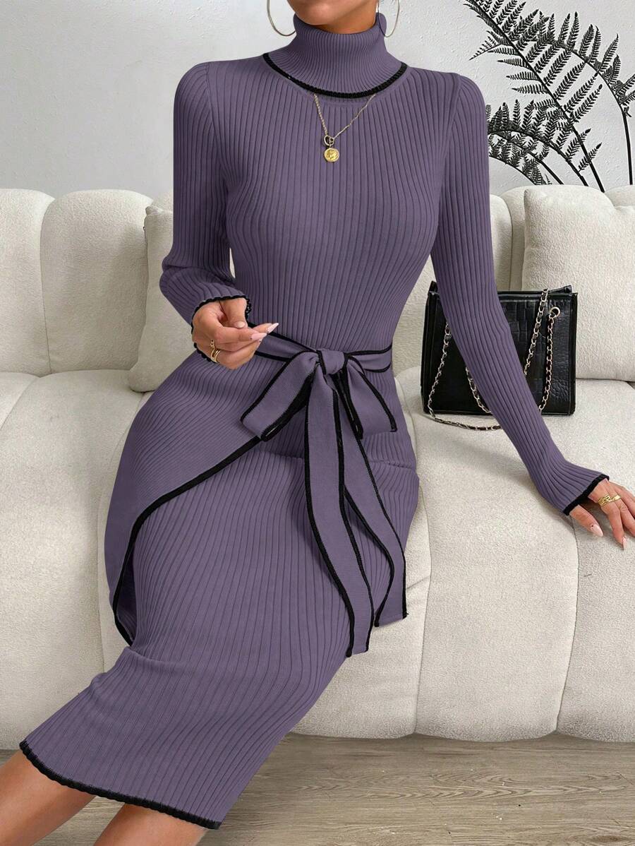 SHEIN Essnce Contrast Binding Turtleneck Belted Sweater Dress
