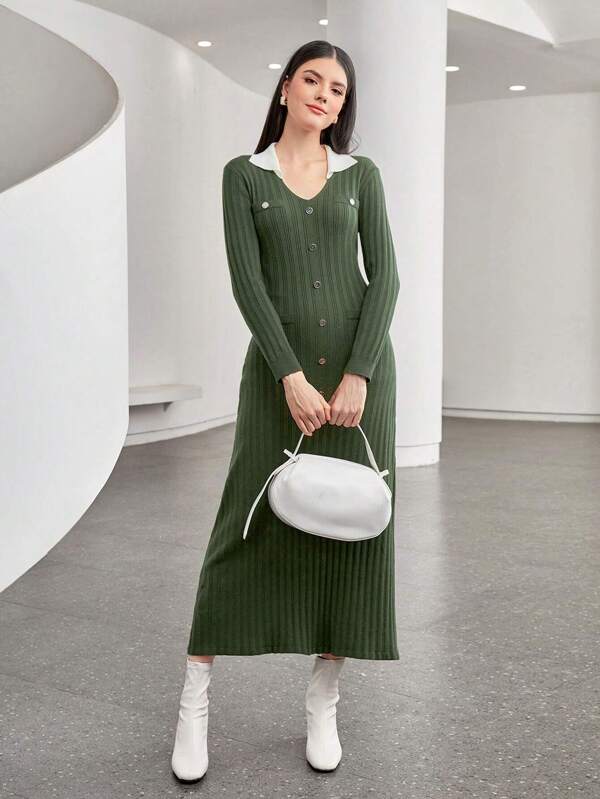 SHEIN Mulvari Contrast Collar Button Front Sweater Dress