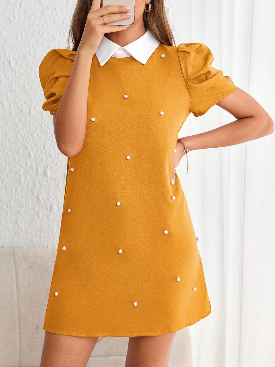 SHEIN Privé Contrast Collar Pearls Beaded Puff Sleeve Dress