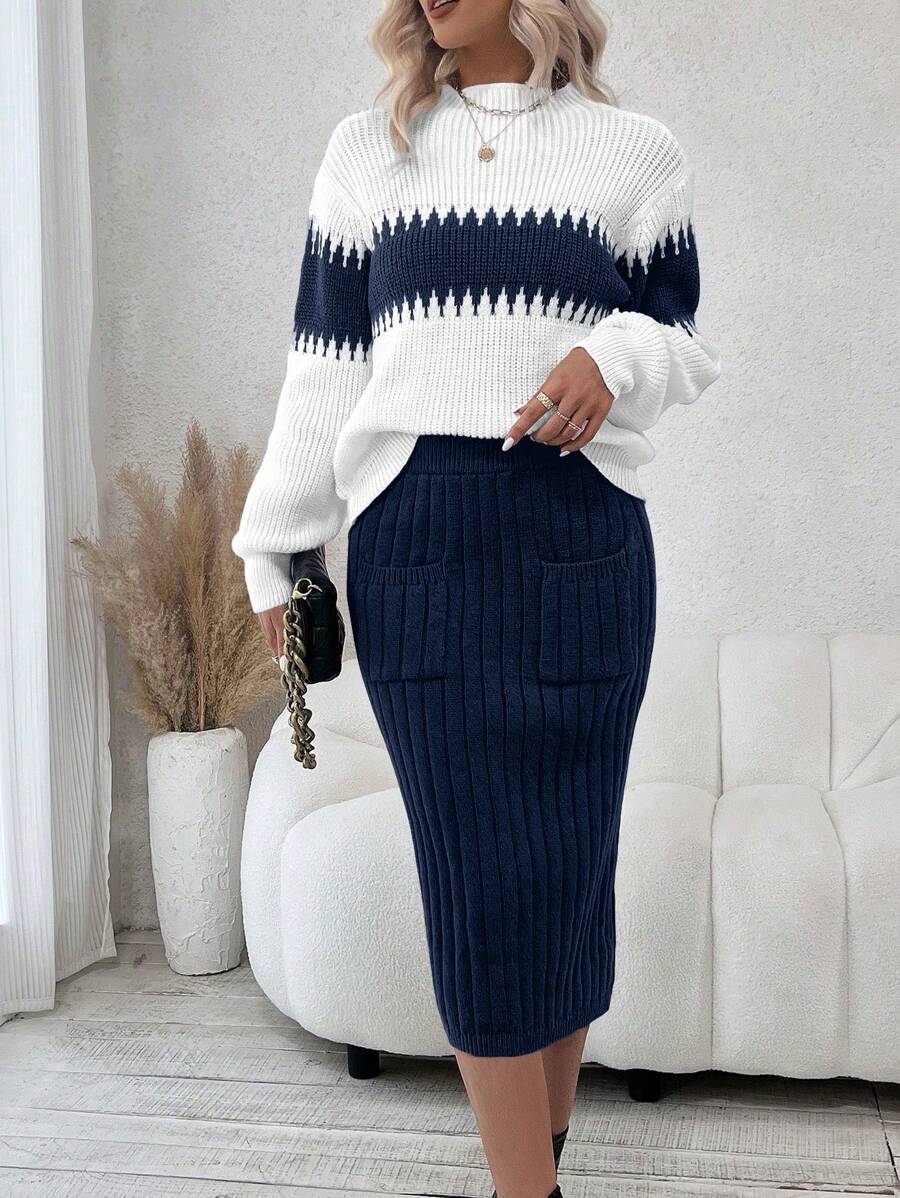 SHEIN Frenchy Contrast Color High Neck Long Sleeve Sweater And Knit A-Line Skirt With Double Pockets Two Piece Set