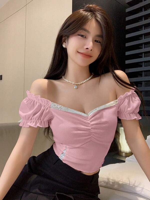 FRIFUL Contrast Color Lace Patchwork Pleated Detail Short Sleeve T-Shirt