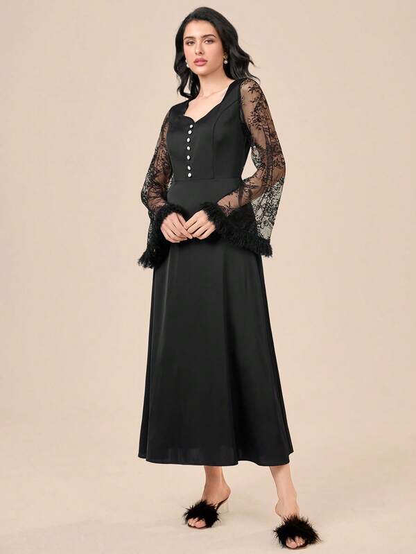 SHEIN Modely Contrast Lace Flounce Sleeve Pearls Beaded Detail Nightdress