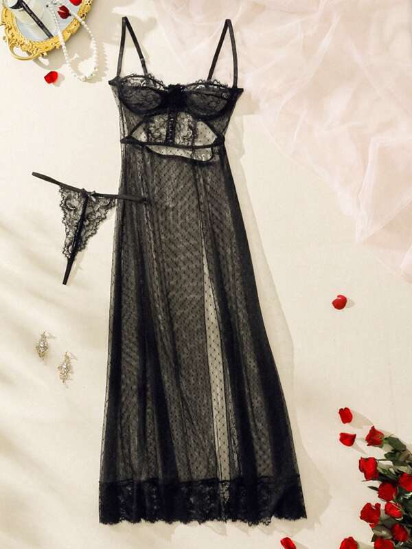 Classic Sexy Contrast Lace Mesh Underwire Slips With Thong