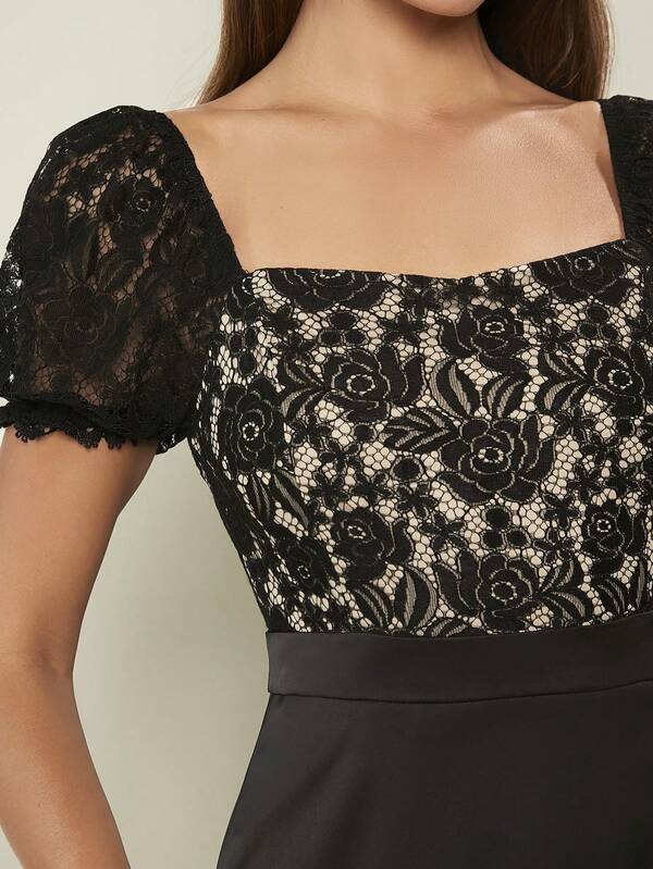 SHEIN Belle Contrast Lace Puff Sleeve Ruffle Trim Wrap Hem Dress