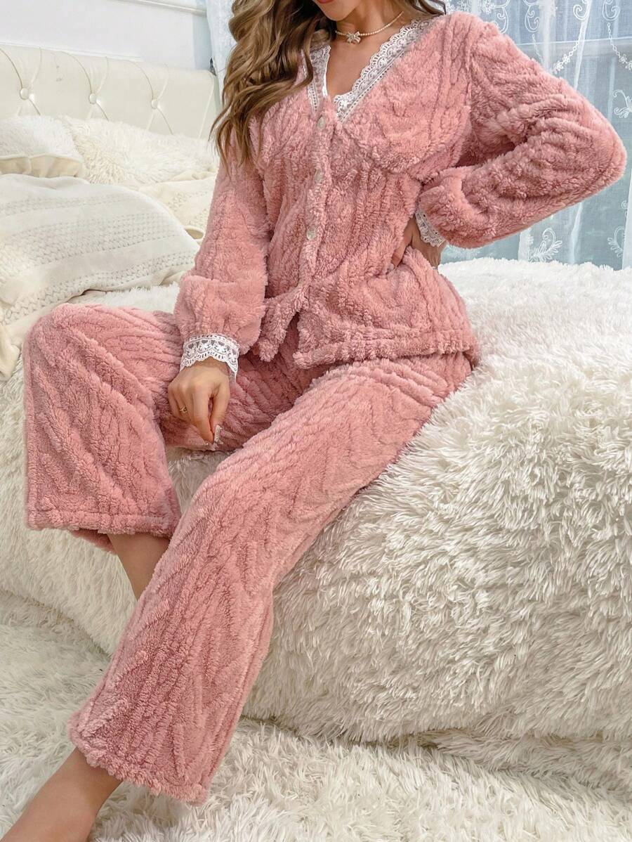 Contrast Lace Trim Flannelette PJ Set
