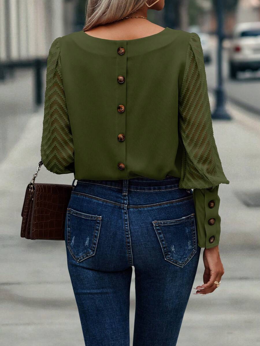 SHEIN LUNE Contrast Mesh Button Back Bishop Sleeve Blouse