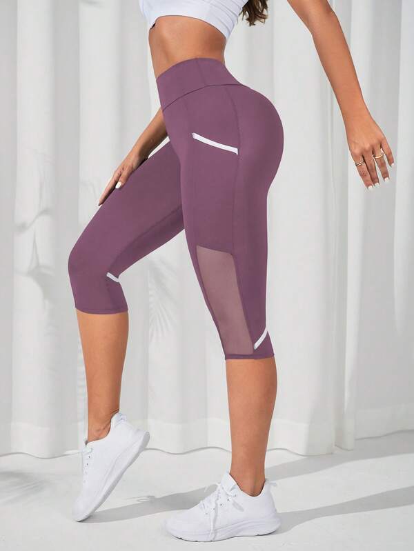 Yoga Futuristic Contrast Mesh Insert Wide Waistband Contrast Binding Capri Sports Leggings