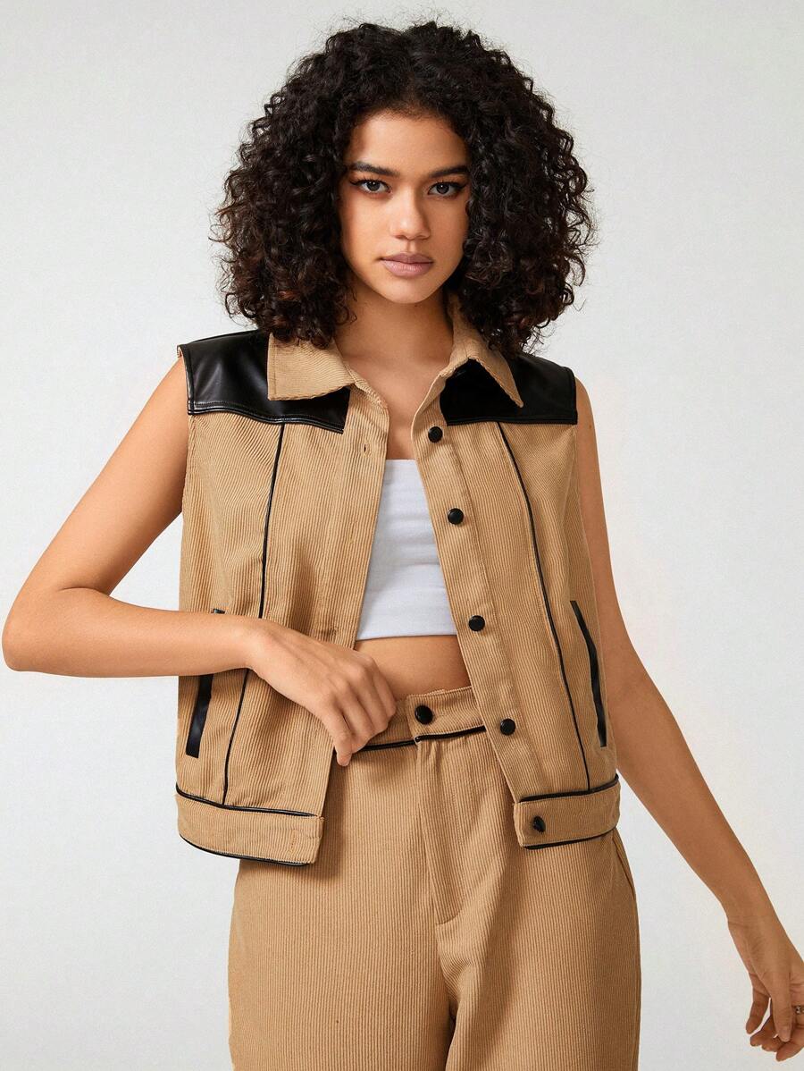Jenny Gyn Contrast PU Leather Panel Vest Jacket