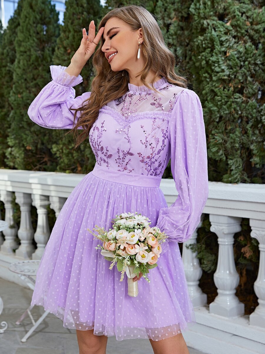Simplee Contrast Sequin Lantern Sleeve Dobby Mesh Dress
