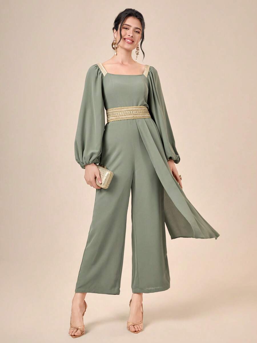 SHEIN Modely Contrast Tape Lantern Sleeve Square Neck Overlay Detail Jumpsuit