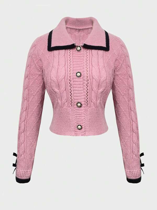 SHEIN MOD Contrast Trim Button Front Cable Knit Cardigan
