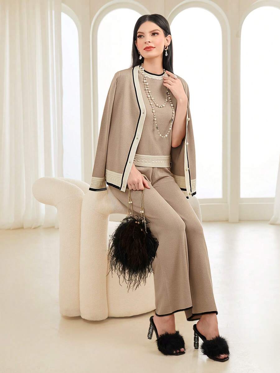 SHEIN Mulvari Contrast Trim Cardigan & Knit Top & Knit Pants