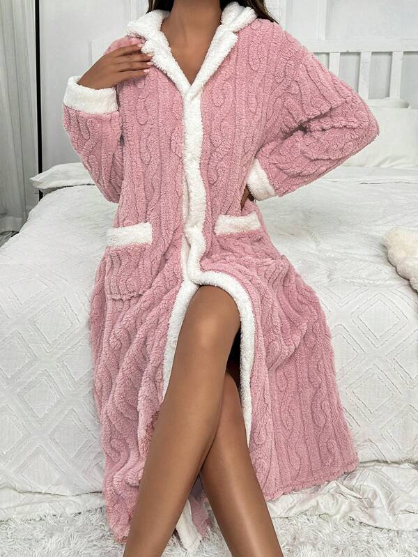 Contrast Trim Dual Pocket Drop Shoulder Hooded Flannelette Lounge Robe