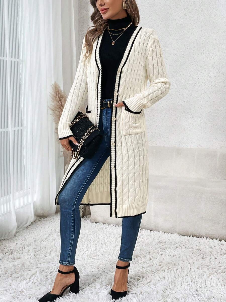 SHEIN Clasi Contrast Trim Dual Pocket Striped Trim Cable Knit Drop Shoulder Cardigan