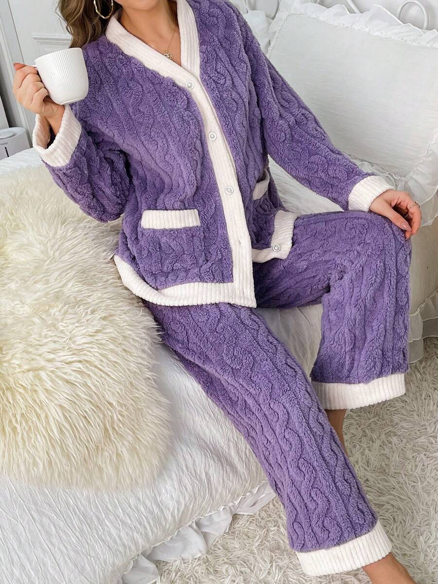 Contrast Trim Flannelette Lounge Set