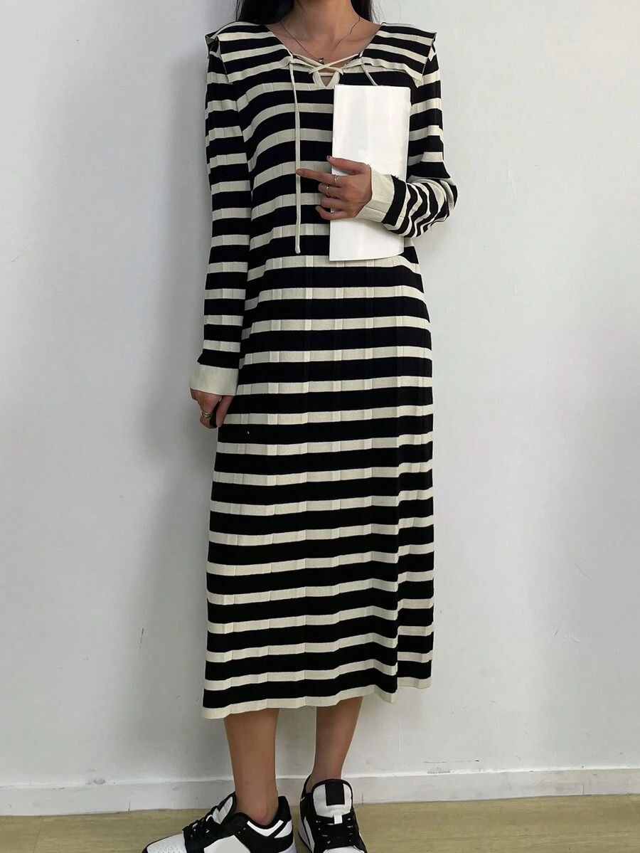 Contrasting Striped Cross Tied Collar Sweater Dress