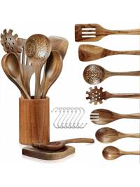 Zazumi Cirelle 8pcs Wooden Cooking Utensil Set, Soup Spoon, Salad Fork, Long Rice Spoon, Slotted Spoon, Spatula, Utensil Holder, Kitchen Use, Rama Kitchen Essentials, Family Dining, Party Use, Housewarming Gift #1 Bestseller