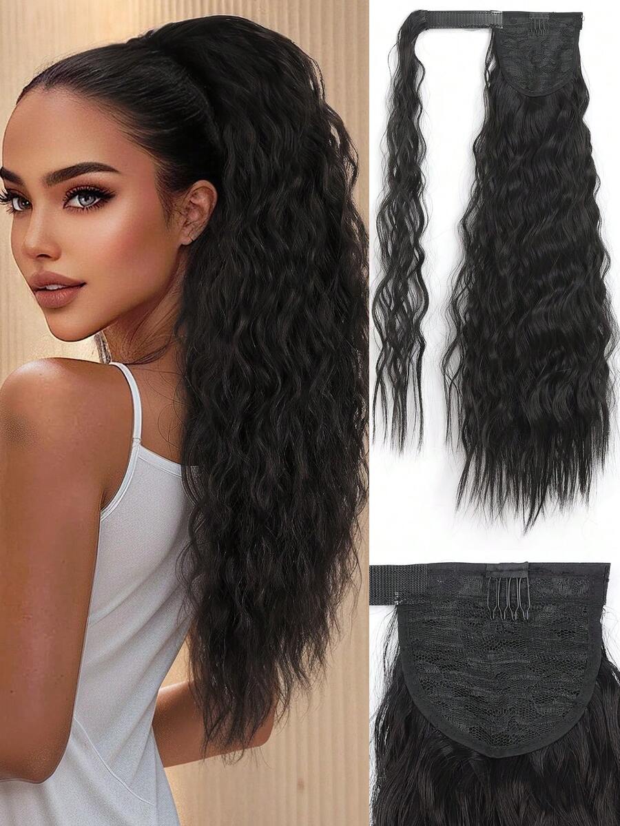 Corn Wave Ponytail Extension Clip in - 22 Inch Long Wavy Curly Wrap Around Pony Tail Heat Resistant Synthetic Hairpiece for Women Natural black