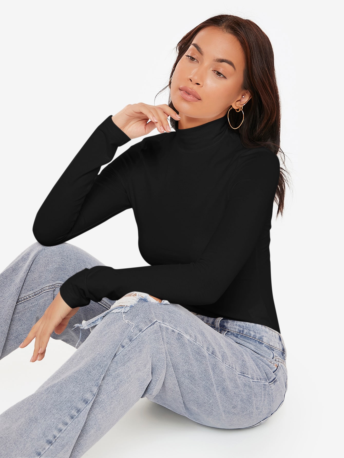 SHEIN BASICS Cotton High Neck Rib-knit Form Fitted Tee