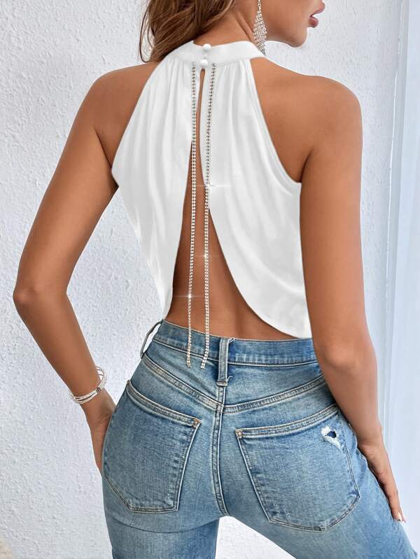 SHEIN BAE Crossover Rhinestone Chain Detail Backless Halter Top
