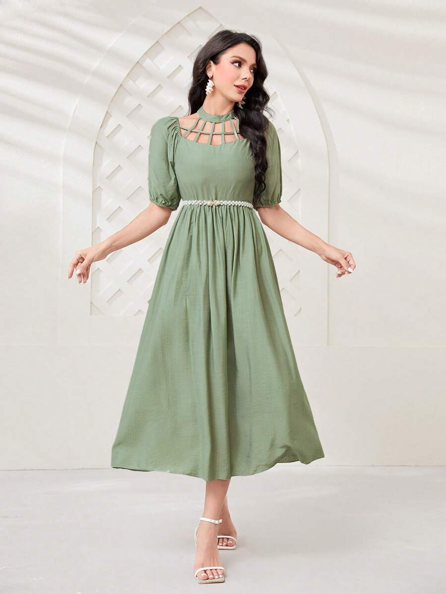 SHEIN Modely Cut Out Front Puff Sleeve Dress Without Belt