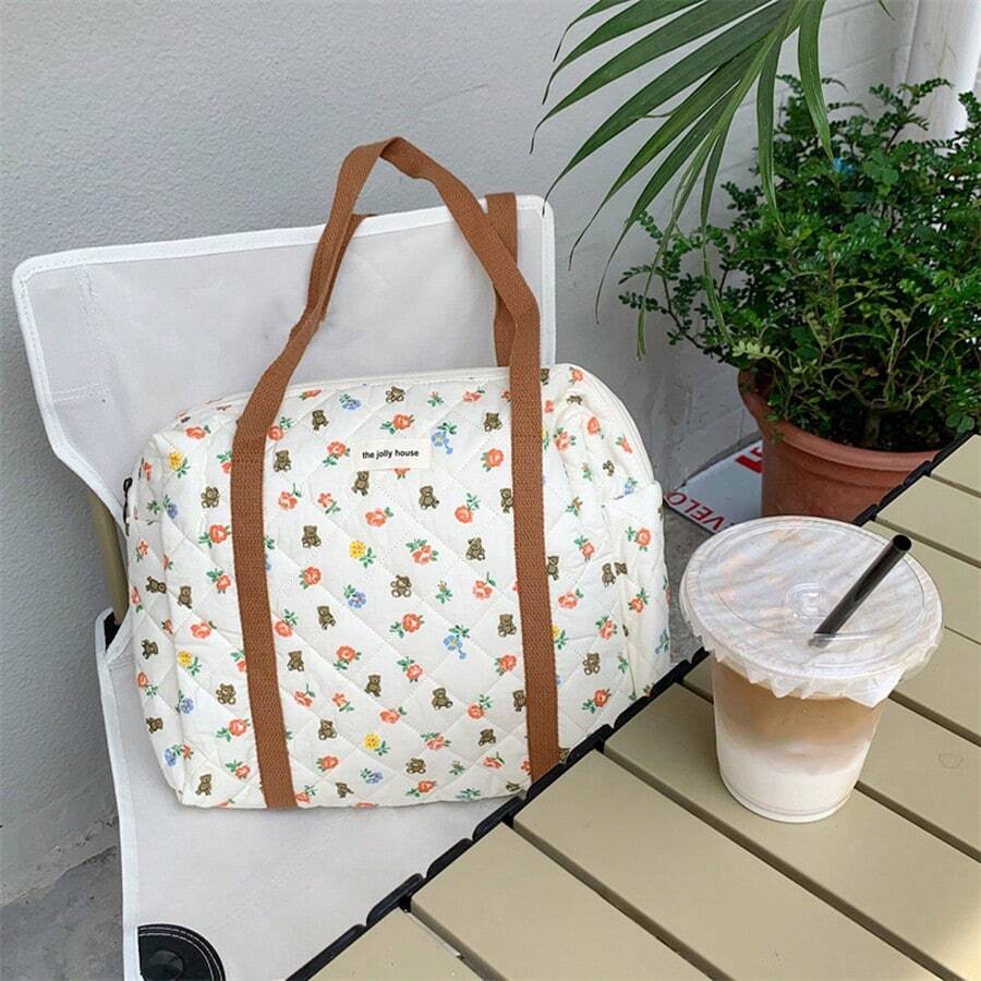 Cute Bear & Floral Patterned Mommy Bag With Stitching Detail, Large Capacity Tote Bag Can Be Carried By Hand Or Shoulder