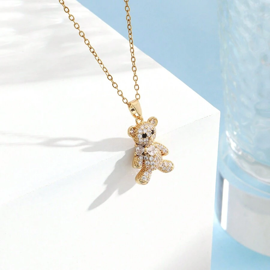 Cute Butterfly Bow Teddy Bear Pendant Necklace For Women With Micro Set , Versatile Titanium Steel Chain