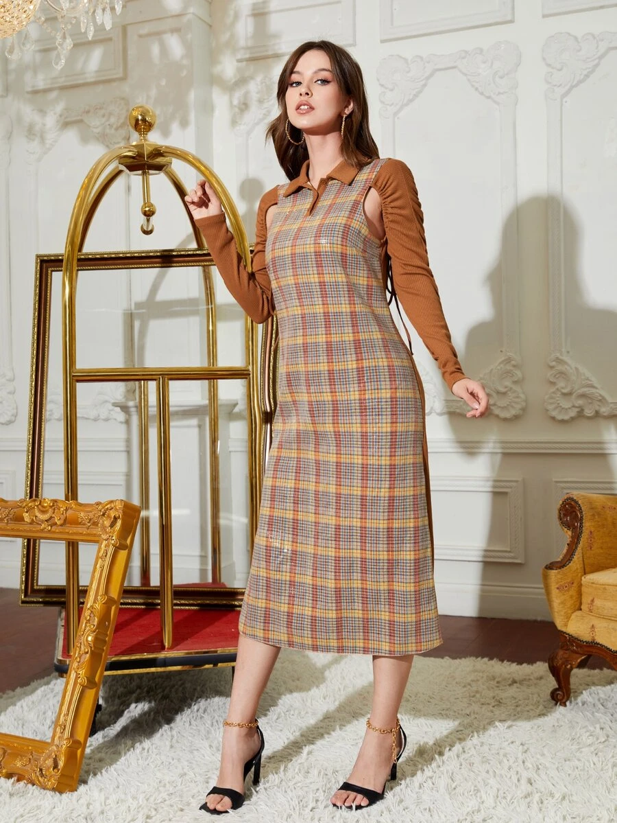 Sayndo Cutout Tie Detail Plaid Fitted Dress