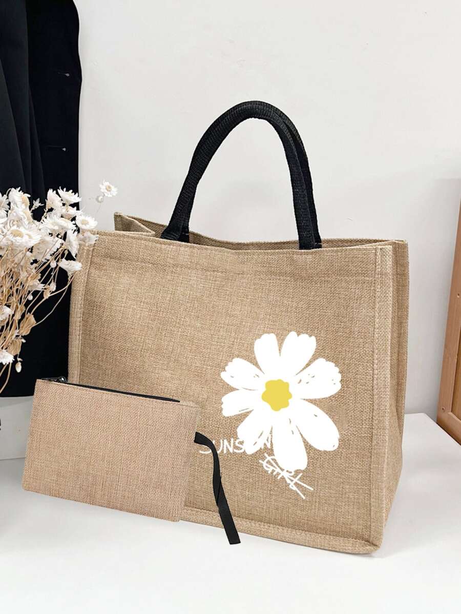 Daisy Floral Print Bag, Women's Stylish Canvas Tote With Zipper For Shopping