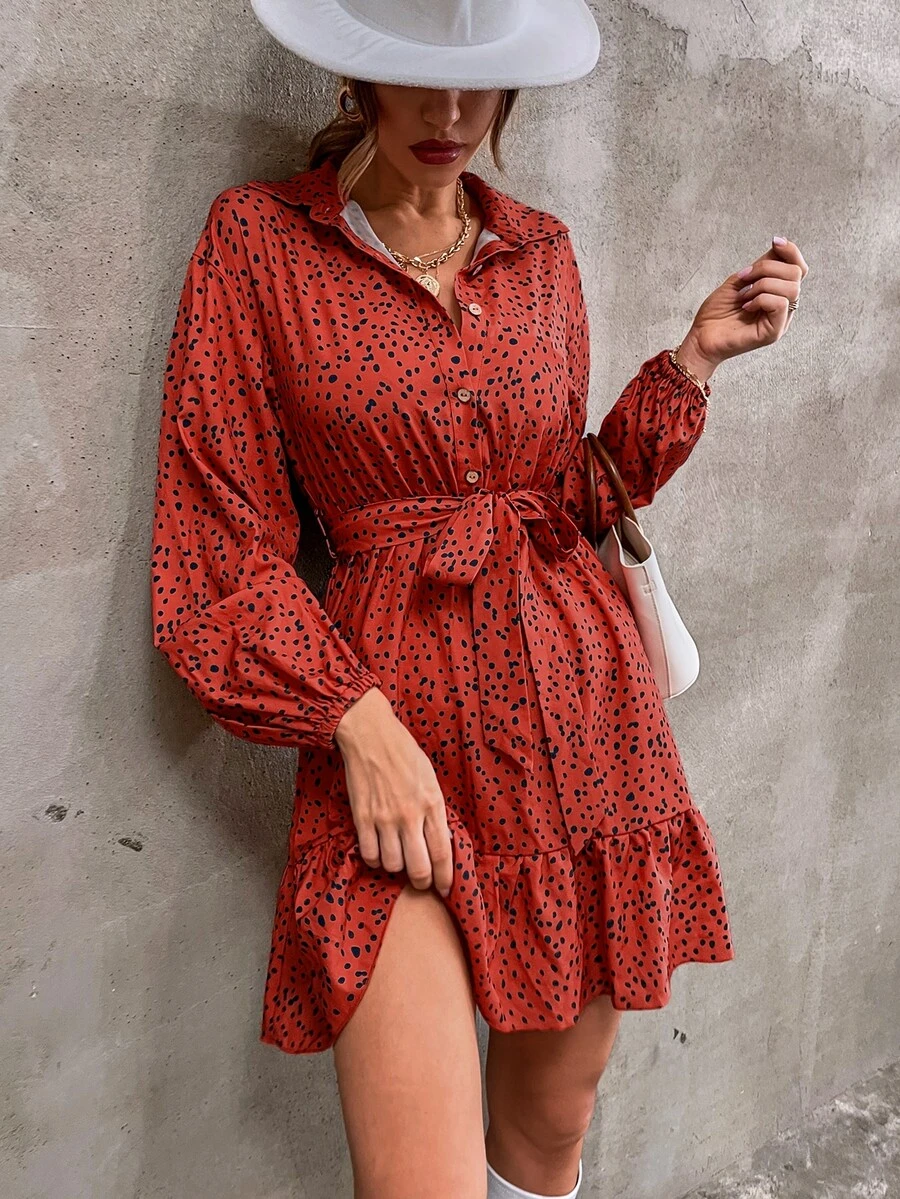 SHEIN VCAY Dalmatian Print Lantern Sleeve Ruffle Hem Belted Shirt Dress