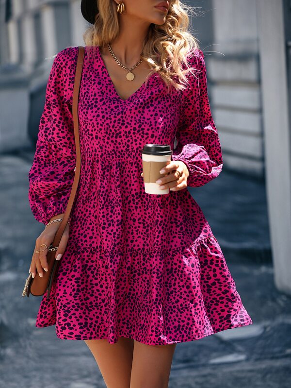 SHEIN LUNE Dalmatian Print Lantern Sleeve Ruffle Hem Smock Dress