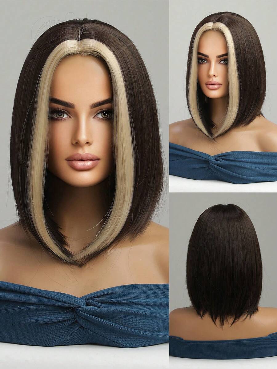 Dark Brown Straight Synthetic Hair Wigs Short Bob Women'S Wig Blonde Highlight Haloween Party Wedding Use