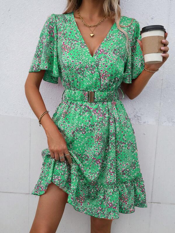 SHEIN VCAY Ditsy Floral Print Butterfly Sleeve Ruffle Hem Dress Without Belt